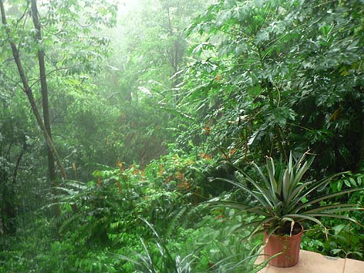 Rain in the jungle - looking off our back porch.