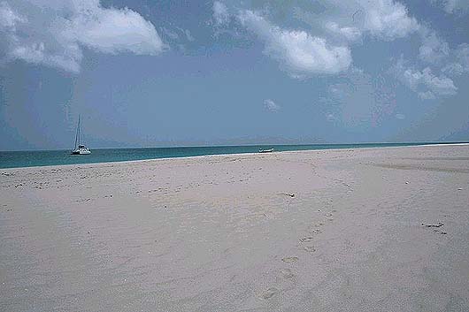Anchored off the beach in about 10 feet of water - Palmetto Point, Barbuda. Our dingy on the beach and tracks in the sand leading to the beach shack.