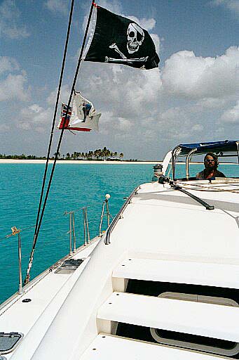 Wim the pirate - looking toward a palm ringed beach shack at the far end of Palmetto Bay.