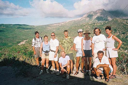 The volcano in the background at the Plymouth overlook. Alex, Karen, Steve, Paula, Brad, Pete, Ann, Wim, Rod, Christa.