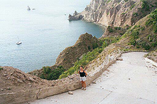 Christa on the road down to Wells Bay.