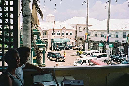 Lunch and overlooking the Circus square in downtown Basseterre. Christa and Rod.