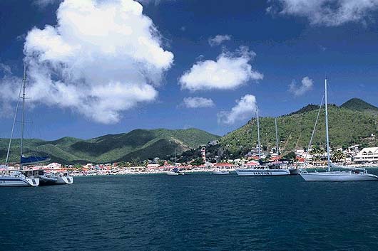 Anchored with the other boats in Marigot Bay, St. Martin. The pretty town of Marigot in the background.