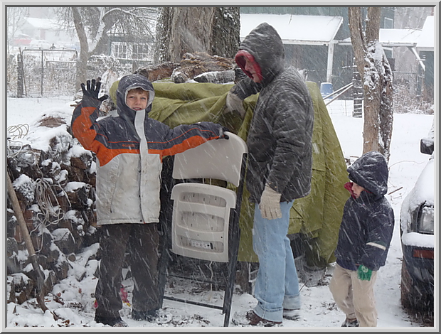 Gianluca, Rod and Mateo setting up the fort in a snowstorm.