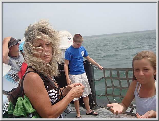 Vicki and Jasmin on the ferry - eating the seagull's food