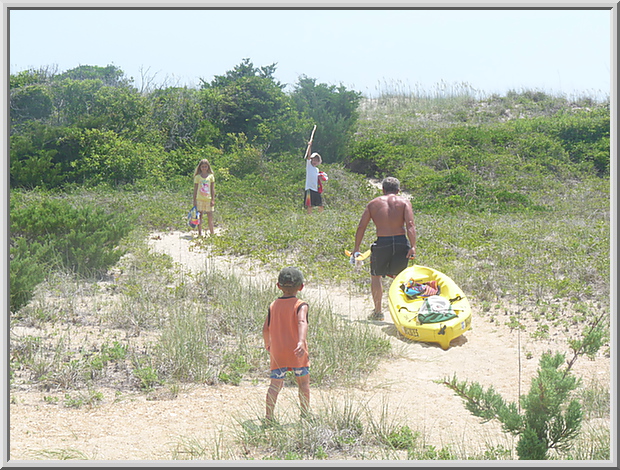 Hauling our toys over the dune to the beach - Mateo, Rod, Jasmin and Gianluca