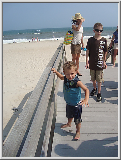 Mateo, Christa and Noah on the boardwalk out to the beach