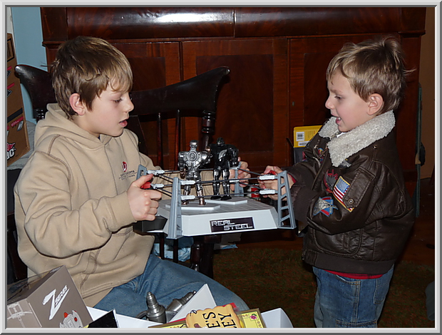 Gianluca and Mateo playing rock-em-sock-em robots.