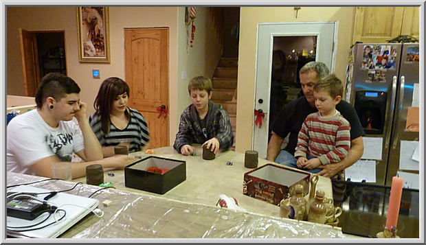 Andrew, Rachael, Gianluca, Rod and Mateo playing Pirates Dice