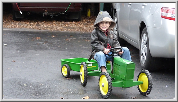 Mateo pedaling his new tractor in Grandma and Grandpa's driveway