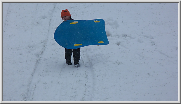 Mateo carrying sled at the bottom of the hill