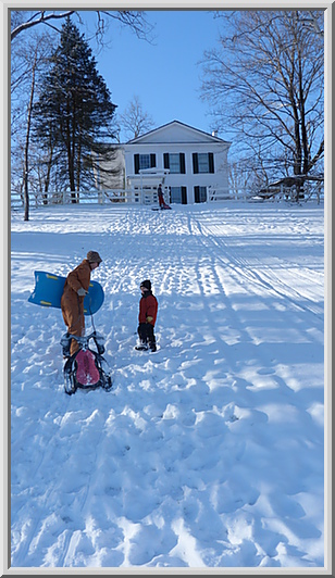 Christa, Mateo and Gianluca pulling their sleds back up the hill