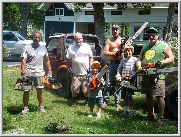 The crew cutting a down tree at Mom and Dad's - Rod, Dad, Mateo, Tim, Gianluca and Jeff