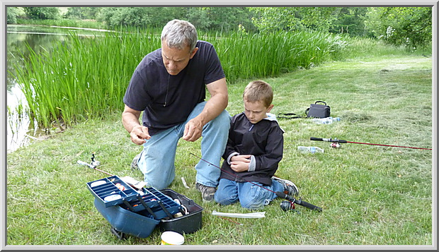 Rod and Mateo getting his fishing pole ready