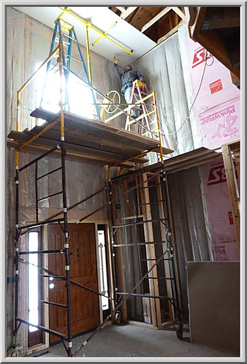 Rod on the ladder, on the scaffolding, hanging drywall in the entryway