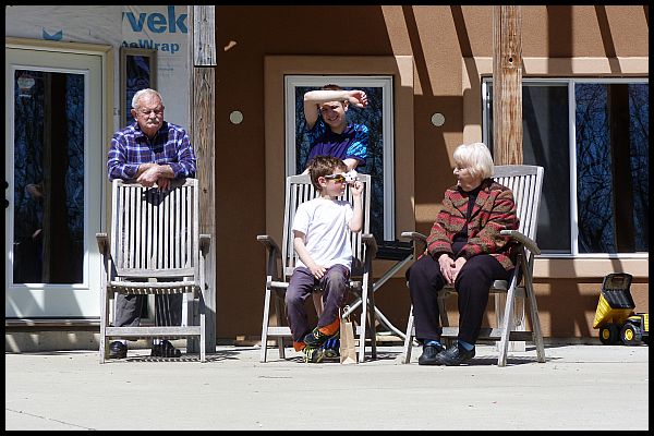 Dad, Mateo, Gianluca and Mom sitting on the lower patio in the sun