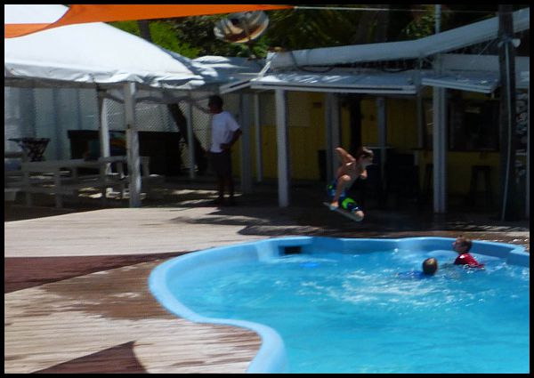 Mateo jumping in the pool at Grabbers
