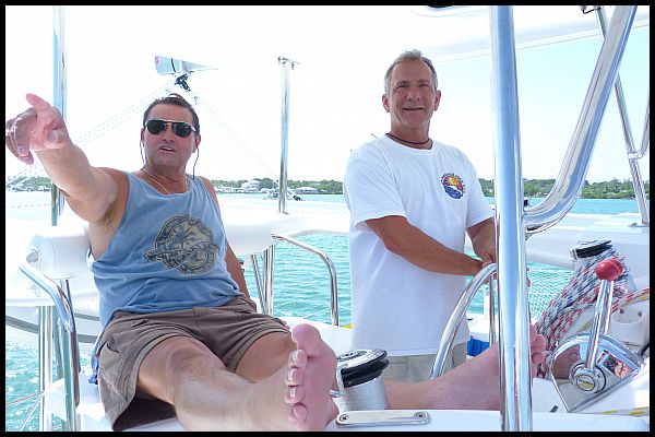 David and Rod at the helm motoring out of Marsh Harbor to start the trip