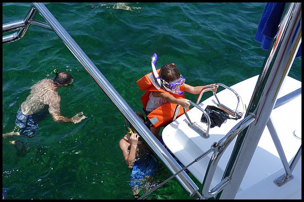 Fishers Bay, snorkeling off the back of the sailboat - Phil, Isaac and Cecilia climbing the ladder