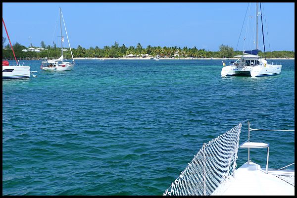 Moored at Fishers Bay, Great Guana - looking in toward the beach with Grabbers Bar and Grill