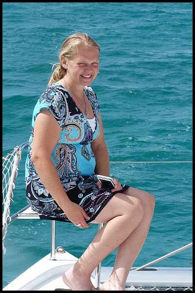 Sandy on the front of the boat