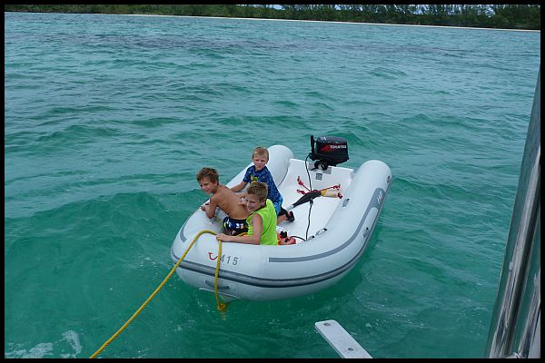 Mateo, Jackson and Isaac playing in the dingy at Powell Cay