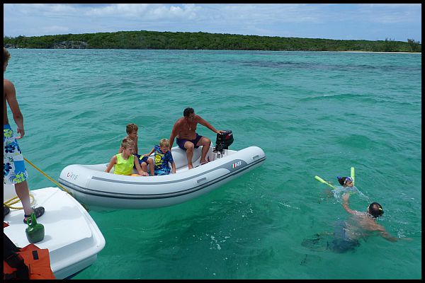 David getting the dingy ready at Powell Cay - Cecilia and Phil snorkeling