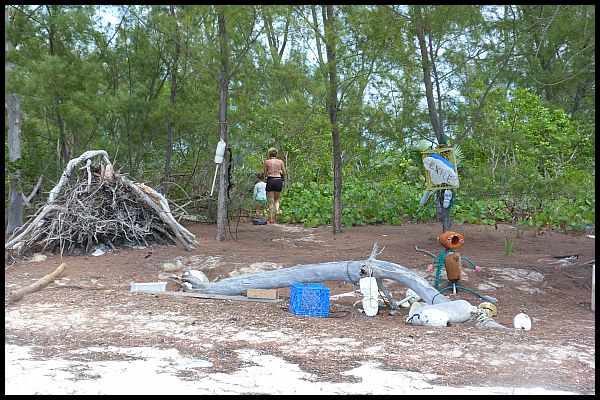 The beach stuff marking the short hike across the narrow isthmus at Powell Cay